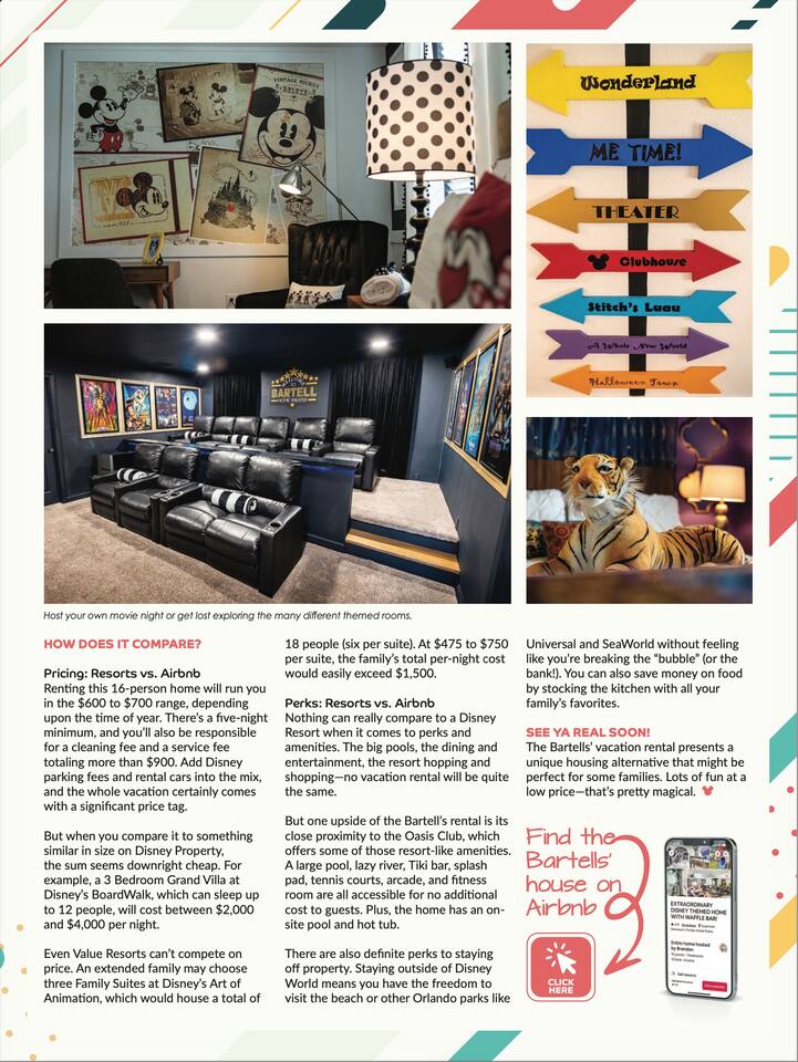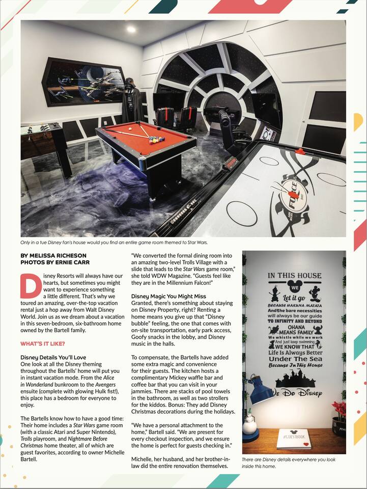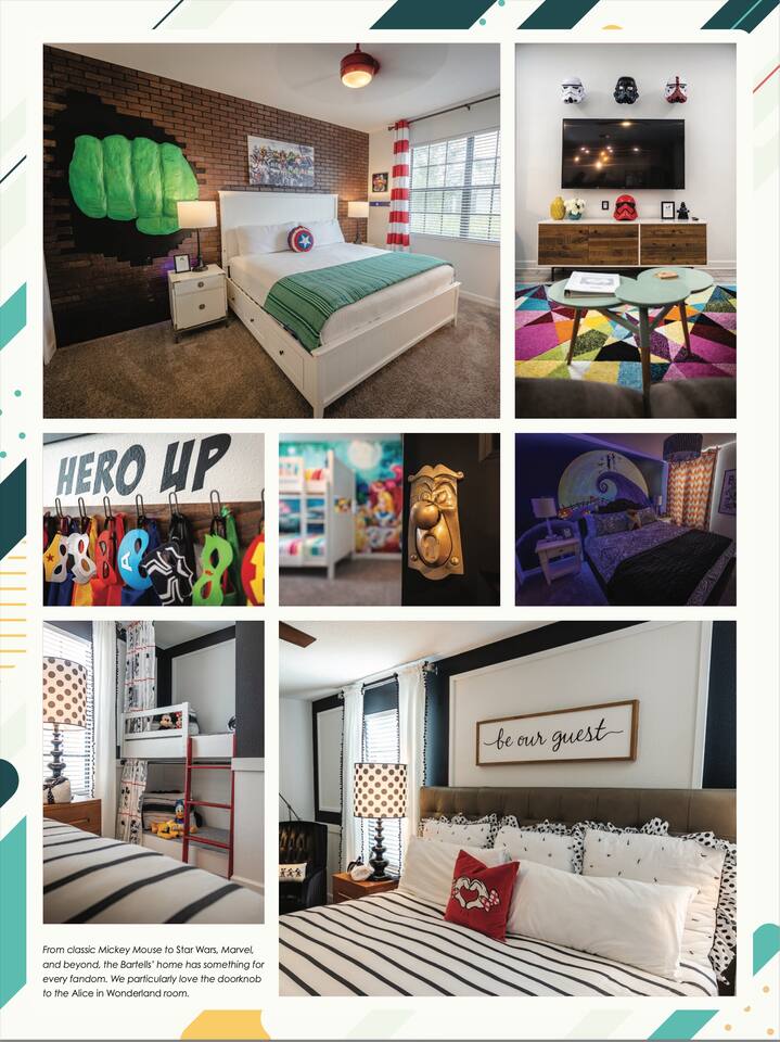 Welcome to Your Custom-Crafted Dream Vacation! Our uniquely designed home offers an extraordinary experience for your family’s ultimate getaway. Thoughtfully curated, it creates a serene retreat while your kids enjoy themed rooms, play areas, and activities. We’ve brought Disney magic to your doorstep, ensuring cherished family memories. With personalized touches and exclusive amenities, our home delivers a vacation like no other—proudly featured in WDW Magazine! See the magic in photos!